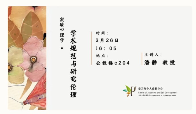 3月26日下午,为增强学生学术道德意识与规范,yl1111永利集团学习与个人成长中心第1次课程在公教楼C栋204室举办,主题为《实验心理学:学术规范与研究伦理》,本次课程主讲为我系潘静教授。