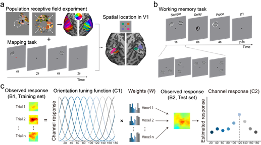 工作记忆作为一项高级认知功能,长久以来被认为由额顶网络的活动所主导。近年来,越来越多的研究发现,感觉皮层也参与了工作记忆的表征,并且可能与额顶脑区一起调控工作记忆的不同方面,这一理论被称为感觉参与假说(sensory recruitment hypothesis)。然而,这一假说仍存在一定争议,感觉皮层在工作记忆表征中是否必要,及其在工作记忆中的关键性作用仍有待揭示。9月2日,yl1111永利集团库逸轩教授团队在Cerebral Cortex(中科院大类一区Top)上在线发表名为“Sensory Recruitment Revisited: Ipsilateral V1 Involved in Visual Working Memory”的研究论文,深入探讨了感觉皮层在工作记忆中的作用。该研究通过高分辨率功能磁共振成像结合基于体素的反向神经编码模型的方法发现,记忆目标同侧和对侧初级视觉皮层均参与了记忆内容的表征,重要的是,对侧皮层的表征仅出现在保持阶段的早期,而同侧皮层的表征则持续到保持阶段的晚期。