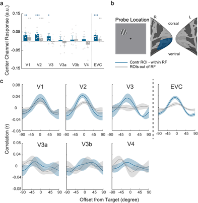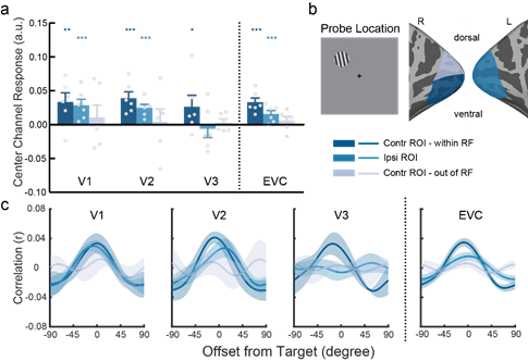 在本研究中,研究者进一步探索在视觉工作记忆任务过程中同侧及对侧视觉皮层是如何分别表征工作记忆内容的。研究利用功能磁共振测量脑活动随任务变化情况,首先使用群体感受野(pRF, population receptive field)定位的方式,对每位被试的不同视觉亚区进行精细的分区(图1a)。此外,每位被试将完成另一项刺激定位任务(mapping task),结合pRF结果以确定实验中视野里每一个空间位置上的刺激所激活的体素(voxel),并在每一个视觉亚区中将这些激活体素作为记忆表征分析的感兴趣区域(ROI)。本研究的主要实验使用视觉延迟回忆任务(图1b),电脑屏幕上首先呈现两个光栅(sample array),在光栅消失后的保持阶段中(maintenance),屏幕中心出现一个线索,指示被试记忆哪一个光栅刺激,随后,在测试过程中(probe array),被试需要使用鼠标来调节光栅的角度,以匹配其记忆中该位置上光栅的原始角度。工作记忆实验使用一种多变量数据分析方法(图1c):反向编码模型(IEM, inverted encoding model),其基本假设是每个体素由不同的朝向选择性神经元组成,这些神经元的表征编码对该体素的表征都会产生贡献,表现为加权平均的形式。因此,使用磁共振信号可以对记忆中的角度表征进行重建,从而获得每个脑区对目标刺激的表征调谐曲线,并以该曲线的中心表征响应(CCR)作为评价该重建强度的指标。