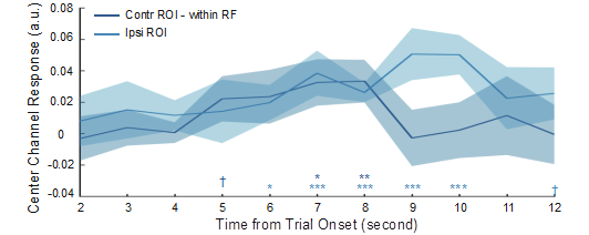 那么,同侧和对侧视觉皮层在工作记忆加工过程中的时间动态变化是怎样的?研究者进一步考察了不同ROI重建强度随时间变化的模式,结果如图4所示,目标刺激的对侧感受野内对应的ROI对目标刺激的表征仅出现在保持阶段早期,而同侧ROI的表征则更为持久,这一结果暗示着同侧和对侧脑区可能在工作记忆信息维持中起到时间序列性表征的作用。