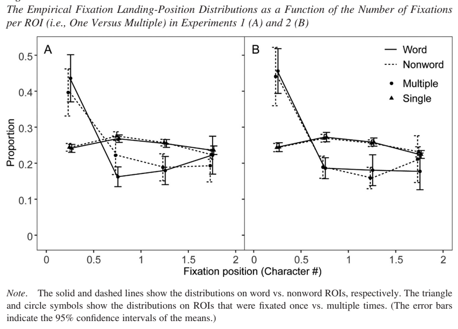 研究团队首先在第一篇论文中基于中文阅读进行了两个眼动实验,参与者阅读完全由双字词组成的特殊句子(但不影响句子的流畅性),实验1中参与者不知情,实验2中明确告知句子结构。无论是知情还是不知情的情况下,参与者的注视位置分布在字和非字区域没有显著差异。实验结果显示,尽管单次和多次注视的落点分布峰值分别靠近兴趣区的中心和前部,呼应先前研究提出的默认注视位置假说,但在无意义的非词区域分析中,这种区分任然存在。最后,通过模拟验证动态调整模型比基于眼动的默认目标定位模型更好地解释了实验结果。