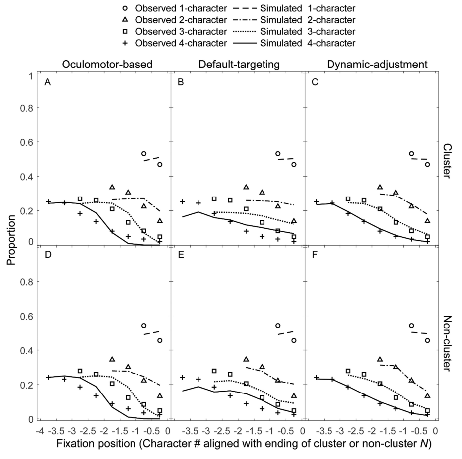 研究团队的第二篇论文进一步推广了动态调节模型的适用范围,探索了实验参与者在搜索线性排列的方块序列时,是否存在最佳眼跳位置。更为重要的是,序列的属性(如字符数量和间隙大小)影响了注视持续时间和向前眼动长度,这表明持续的刺激加工会影响决策过程中“何时以及往何处(即眼动距离有多远)”移动眼睛。最后,通过比较简单的眼动基准、默认目标和动态调节三种理论模型的模拟结果,研究者发现动态调整模型的表现优于其它两种理论。这一发现揭示动态调整策略不仅能反映中文阅读中的基本感知和运动约束,并可被应用于多种视觉任务。