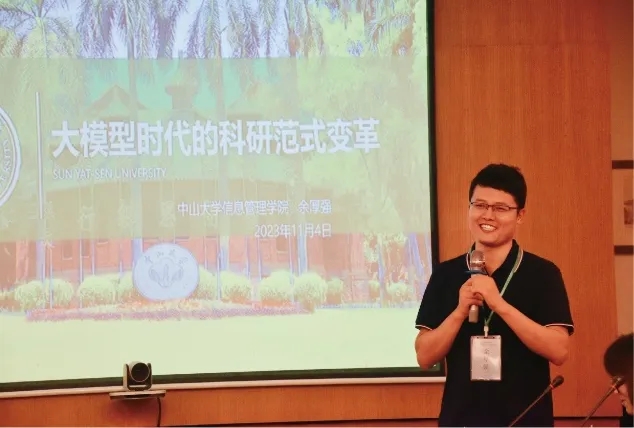 来自中山大学信息管理学院的余厚强副教授的报告关注大模型时代的科研范式变革。人工智能的出现为第五范式的提出提供了可能性,第五范式就是人工智能驱动的科学研究,指人工智能技术与科学研究深度融合,提高科研生产力,促进科学发展。人工智能作为辅助工具可以为科研活动带来诸多便利,比如赋能科研选题,助力实验设计与执行,增强数据处理与分析,推动科学传播与交流,支持日常科研活动与改变科研模式与环境等等。而目前已有对第五范式的实践,比如CFFF智算平台,伏羲大模型,深势科技,药物计算设计平台:hermite,Google deepmind,Alphafold2,Ithaca 等。余教授认为,我们应该更多地将大模型与社会科学结合起来,建立合理的科学体系,为未来研究做好准备。报告结束后,有老师对AI可能导致之后研究工作同质化表示担心,而余教授认为AI很大程度是方便老师们开展重复性工作,能让老师们更多专注创造性工作,因此不会造成同质化。
