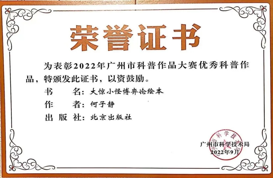 我系何子静老师著写的《大惊小怪博弈论绘本》获得了2022年广州市优秀科普作品的荣誉。该绘本系列全套共六本,由北京出版社出版。该作品将儿童社会认知、亲社会发展的重要问题与博弈论的整体理论框架有机结合,以生动活泼的互动情境与精美有趣的画面展现在读者面前,实现了心理学科学知识的普及与传播,有助于培养理性平和的心态。