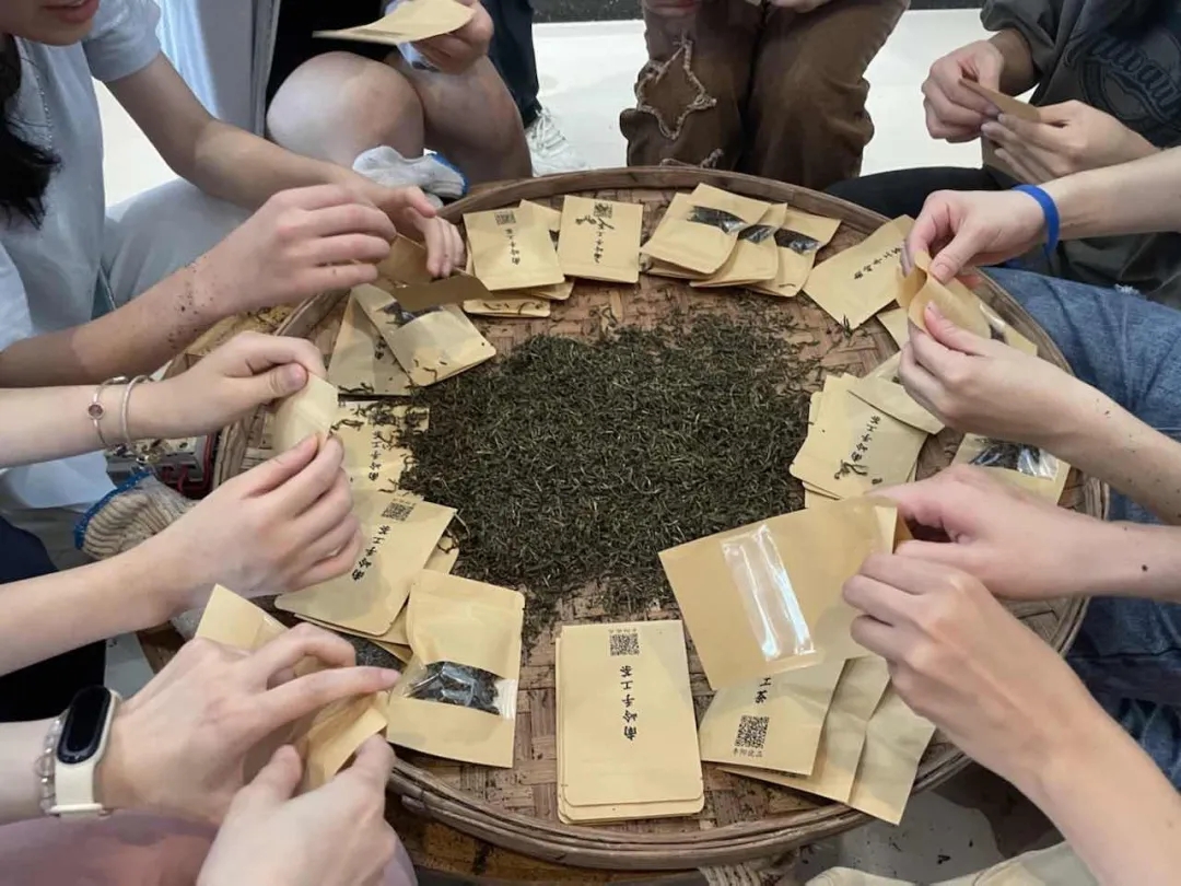 学习农业劳动技能是实践团的重点体验环节。行程第二天,同学们来到丰阳南岭珍羞茶业公司,品尝广东茶王南岭野生红茶,学习炒制茶叶,并进行茶叶炒制和包装劳动实践。同学们对绿茶制作十分感兴趣,在师傅科普茶叶知识和教授基本操作手法后,纷纷投入到炒茶、揉茶等茶叶生产步骤中。最后,每位同学都收获了自己亲手劳动得来的纯手工制茶叶。