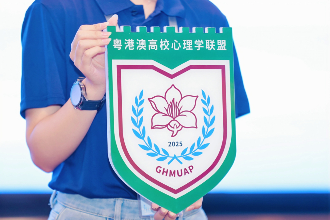 随后,粤港澳高校心理学联盟铭牌正式发布,铭牌志为旌旗形态,融合学术的严谨性与粤港澳独特的地域文化,整体呈现“专业、开放、融合、温暖”的视学气质。设计上,选取象征粤港澳三地的标志性花卉-木棉、紫荆、莲花作为视觉核心,以三花一体的“大湾区花”代表三地融合,体现粤港澳大湾区的协同融合与整体共同发展。花卉下方以心理学科标识“心”形结构为托,上方为万里长城的九峰寓意9所创盟单位联合发起,环绕大湾区花的枝叶代表联盟成员同心相连,花叶相映枝繁叶茂。联盟铭牌表现了粤港澳心理学联盟的区域特点、专业属性和目标价值,传递出大湾区心理学人情感联结的温暖意象。