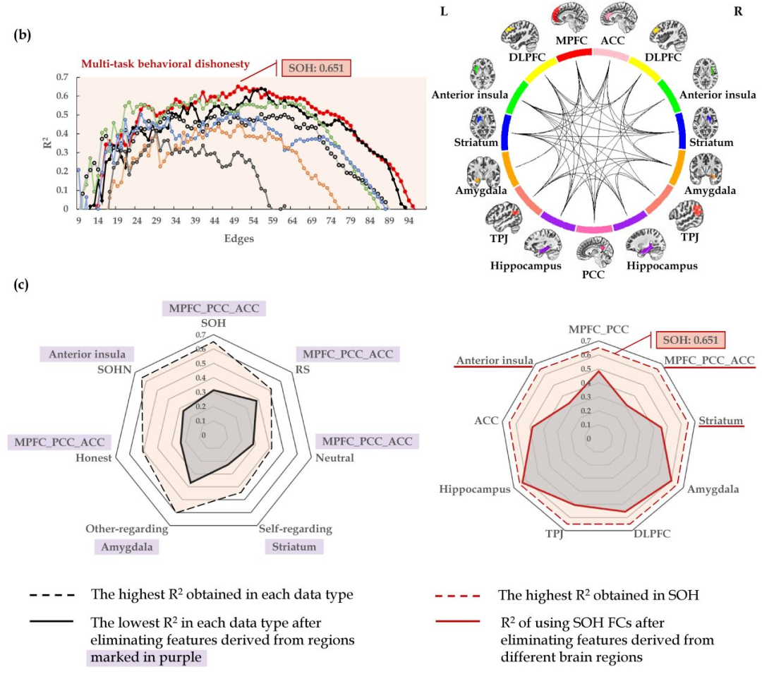 该研究通过回顾关于不诚实的神经影像学研究文献,构建了一个包含15个脑区的假设驱动网络,并进一步提出两个竞争性网络模型(非假设驱动网络和诚实特质驱动网络)。通过比较人口统计学变量、诚实特质、三个神经网络的七种功能连接数据对多情境不诚实行为的预测能力,结果表明诚实特质能预测多情境不诚实行为但预测能力有限,而假设驱动网络中观看与谎言相关视频时的神经模式预测效果最好。假设驱动网络的视频观看数据类型对多情境不诚实行为指标的预测效果最优,而静息态数据则在预测诚实特质得分上展现出最优表现(图2)。最后,该研究量化了不同脑区在预测多任务行为不诚实方面的贡献。在假设驱动网络中的15个脑区中,中线自我相关脑区(内侧前额叶皮层、前扣带回和后扣带回)、前岛叶和纹状体在预测多任务行为不诚实方面贡献最大。