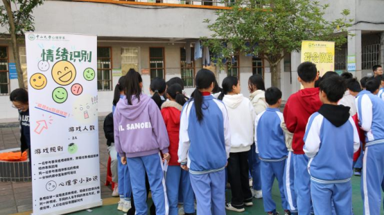 “情绪识别” 摊位上,两人一组默契配合。一名同学观看情绪图片后,通过丰富的表情与肢体动作传递情绪信号,另一名同学则化身“情绪侦探”,细心捕捉每一个细节。从开心的咧嘴大笑到愤怒的皱眉瞪眼,从悲伤的低头垂泪到惊讶的瞪大眼睛,不同的情绪表达方式在互动中碰撞,既让同学们学会了观察与共情,也印证了表情作为情绪沟通桥梁的重要意义。