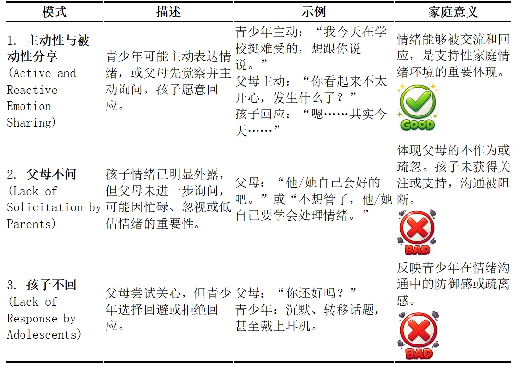 孩子的情绪世界丰富多样,既有积极情绪,也有消极情绪。有些家庭可能只关注消极情绪,有些只关注积极情绪,还有的家庭两者都关注,或者两者都忽略。那么,父母与青少年之间在积极和消极情绪上的沟通模式,会如何共同影响青少年的心理适应? 换句话说,本研究不仅关注孩子在遇到挫折或负面情绪时父母的回应,也关注孩子在开心、兴奋等积极情绪下父母的互动,旨在同时揭示两类情绪沟通对青少年心理发展的作用。