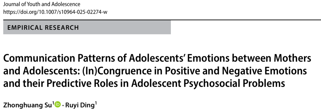 Su, Z., & Ding, R. (2025). Communication Patterns of Adolescents’ Emotions between Mothers and Adolescents: (In)Congruence in Positive and Negative Emotions and their Predictive Roles in Adolescent Psychosocial Problems. Journal of Youth and Adolescence. https://doi.org/10.1007/s10964-025-02274-w