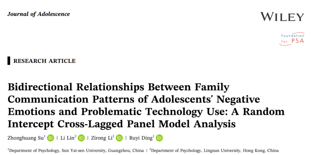 Su, Z., Lin, L., Li, Z., & Ding, R. (2025). Bidirectional Relationships Between Family Communication Patterns of Adolescents’ Negative Emotions and Problematic Technology Use: A Random Intercept Cross‐Lagged Panel Model Analysis. Journal of Adolescence. https://doi.org/10.1002/jad.70070