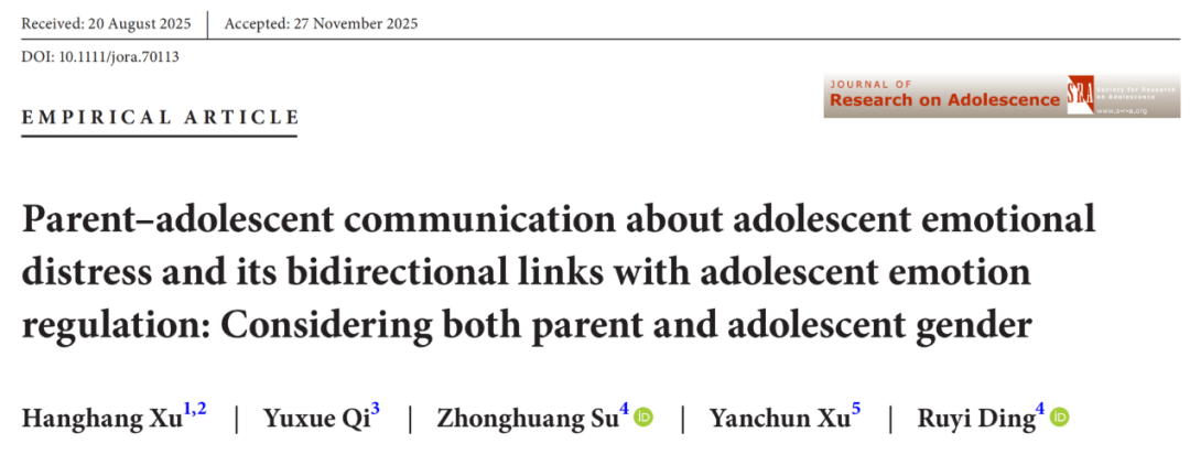 Xu, H., Qi, Y., Su, Z., Xu, Y., & Ding, R. (2025). Parent–adolescent communication about adolescent emotional distress and its bidirectional links with adolescent emotion regulation: Considering both parent and adolescent gender. Journal of Research on Adolescence. Advance online publication. https://doi.org/10.1111/jora.70113