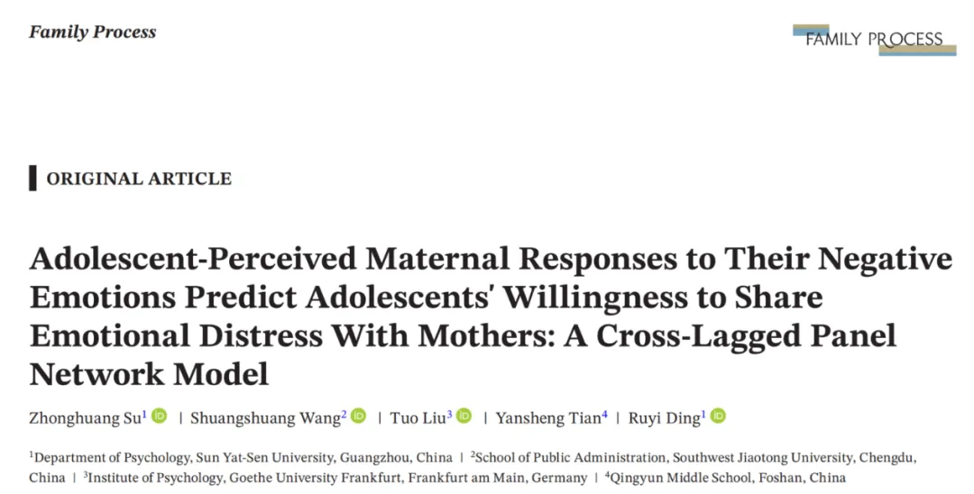 本研究发表在家庭研究领域家庭教育领域的知名期刊Family Process (JCR Q1, 中科院三区)(Su, Wang, et al., 2025)。yl1111永利集团2024级硕士生苏中煌与西南交通大学公共管理学院助理教授王双双为共同第一作者,yl1111永利集团丁如一副教授为通讯作者。德国法兰克福大学心理研究所的刘拓博士以及佛山市青云中学的田严生老师也是本研究的重要参与作者。
